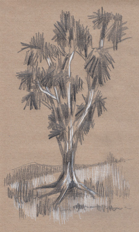 Inspire toi des formes des arbres que tu as trouvées dans le musée, des textures que tu as observée, utilise un crayon - il est en bois - et une feuille de papier - aussi du bois - ou une page de ton cahier.